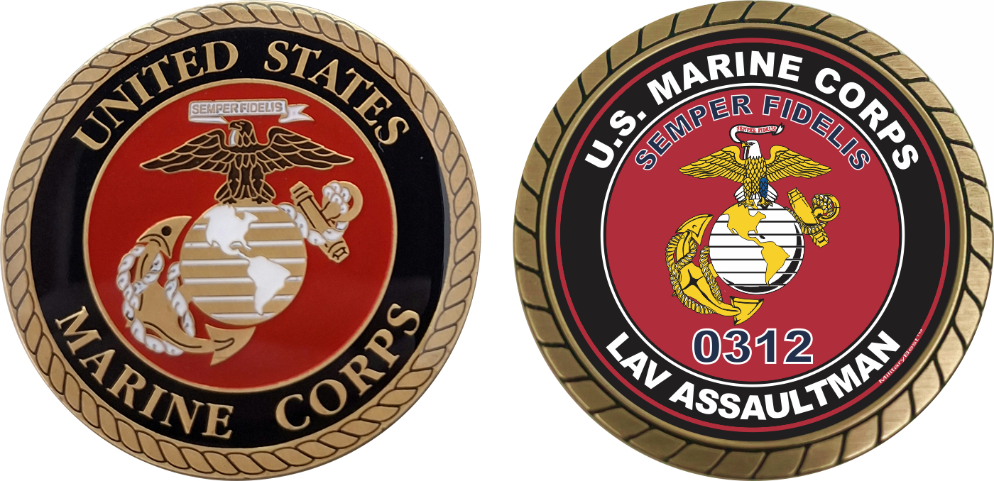 This U.S.M.C. MOS 0312 LAV Assaultman Challenge Coin is proudly offered by MilitaryBest. This Officially Licensed Marine Corps coin has beautiful enamel finish on one side and an organized crisp clean U.S.M.C. MOS 0312 LAV Assaultman design on the opposite side.