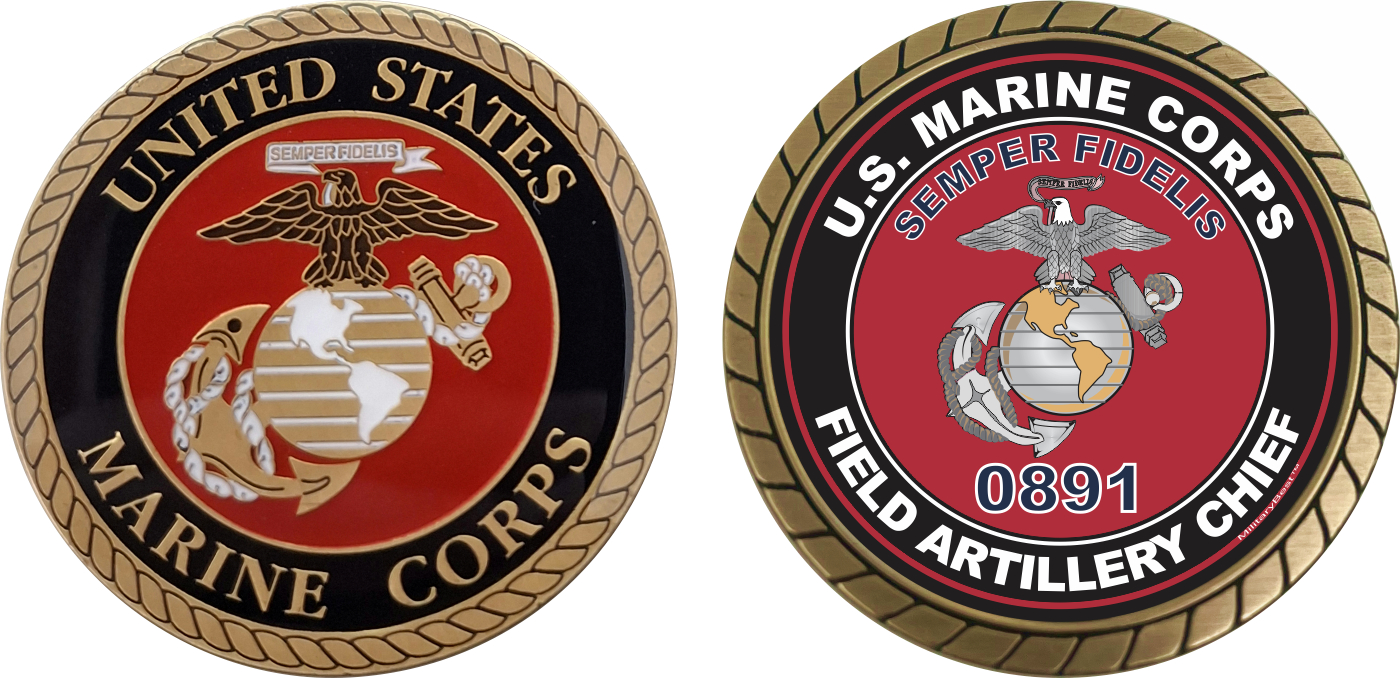 This U.S.M.C. MOS 0891 Field Artillery Chief Challenge Coin is proudly offered by MilitaryBest. This Officially Licensed Marine Corps coin has beautiful enamel finish on one side and an organized crisp clean U.S.M.C. MOS 0891 Field Artillery Chief design on the opposite side.