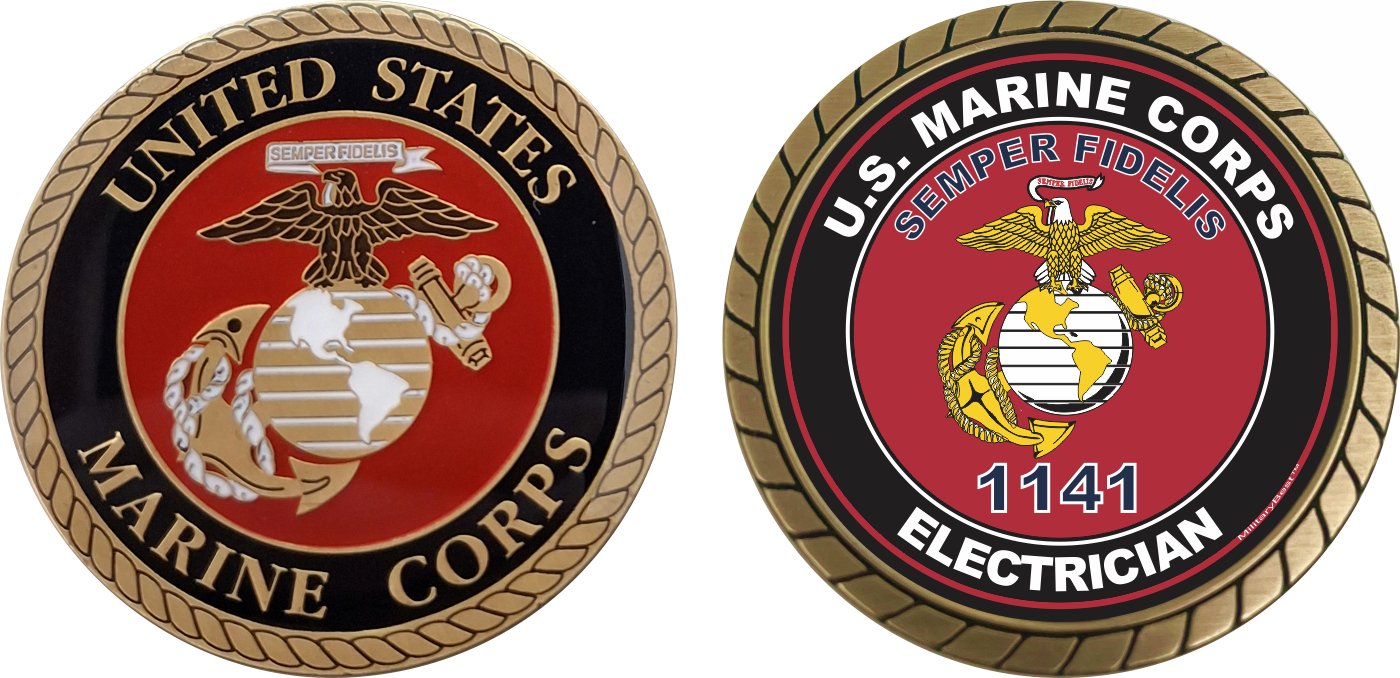 This U.S.M.C. MOS 1141 Electrician Challenge Coin is proudly offered by MilitaryBest. This Officially Licensed Marine Corps coin has beautiful enamel finish on one side and an organized crisp clean U.S.M.C. MOS 1141 Electrician design on the opposite side.