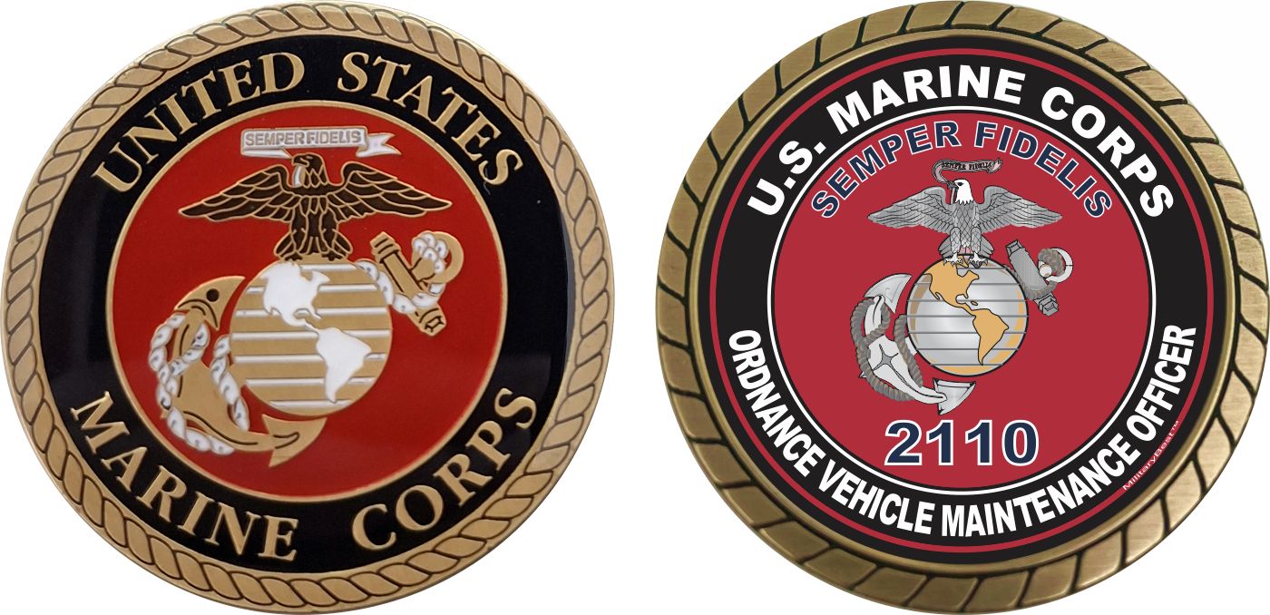 This U.S.M.C. MOS 2110 Ordnance Vehicle Maintenance Officer Challenge Coin is proudly offered by MilitaryBest. This Officially Licensed Marine Corps coin has beautiful enamel finish on one side and an organized crisp clean U.S.M.C. MOS 2110 Ordnance Vehicle Maintenance Officer design on the opposite side.