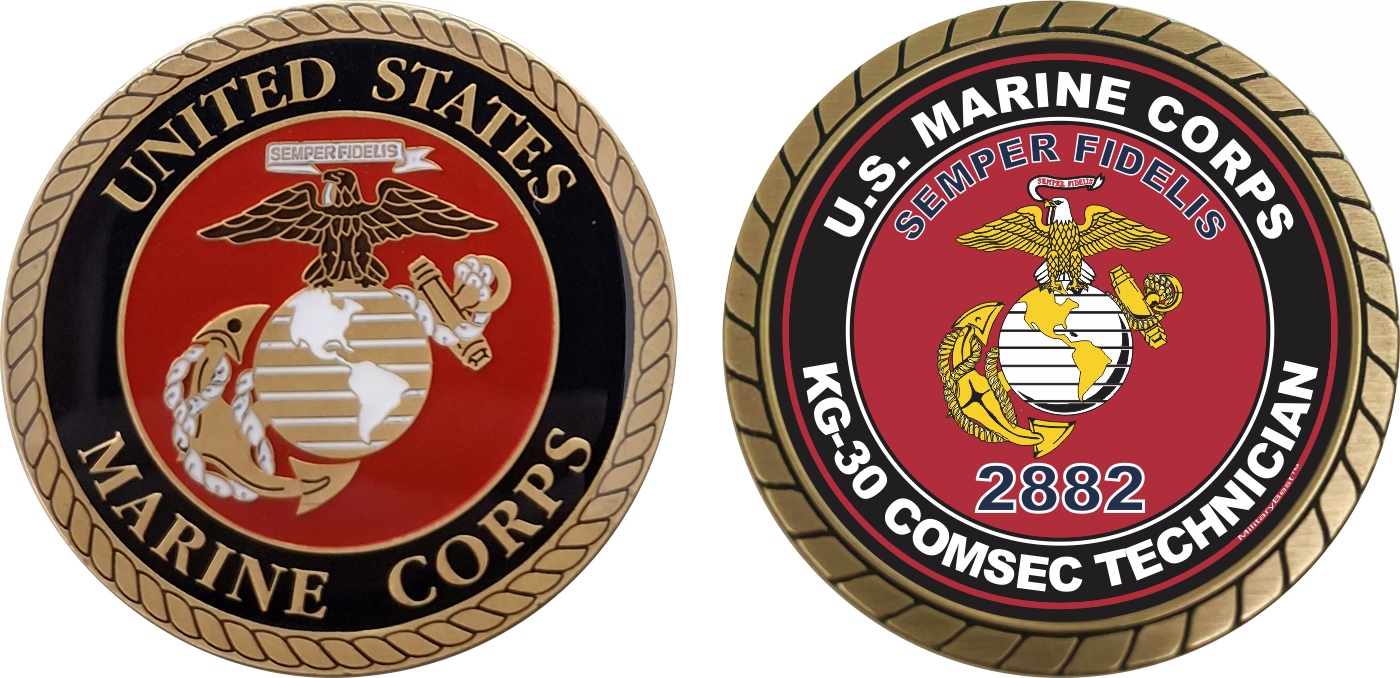 This U.S.M.C. MOS 2882 KG-30 COMSEC Technician Challenge Coin is proudly offered by MilitaryBest. This Officially Licensed Marine Corps coin has beautiful enamel finish on one side and an organized crisp clean U.S.M.C. MOS 2882 KG-30 COMSEC Technician design on the opposite side.
