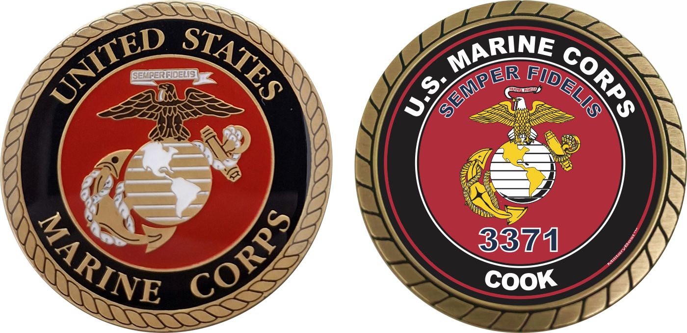 This U.S.M.C. MOS 3371 Cook Challenge Coin is proudly offered by MilitaryBest. This Officially Licensed Marine Corps coin has beautiful enamel finish on one side and an organized crisp clean U.S.M.C. MOS 3371 Cook design on the opposite side.