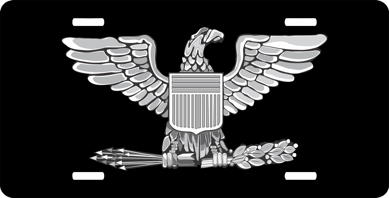 This USMC O-6 Bird Colonel Officers Rank License Plate is made from heavy gauge aluminum and has a baked enamel finish to last for many years of use. Each plate measures 5 15/16" x 11 15/16". This license plate would make a wonderful addition to your collection or a great gift.