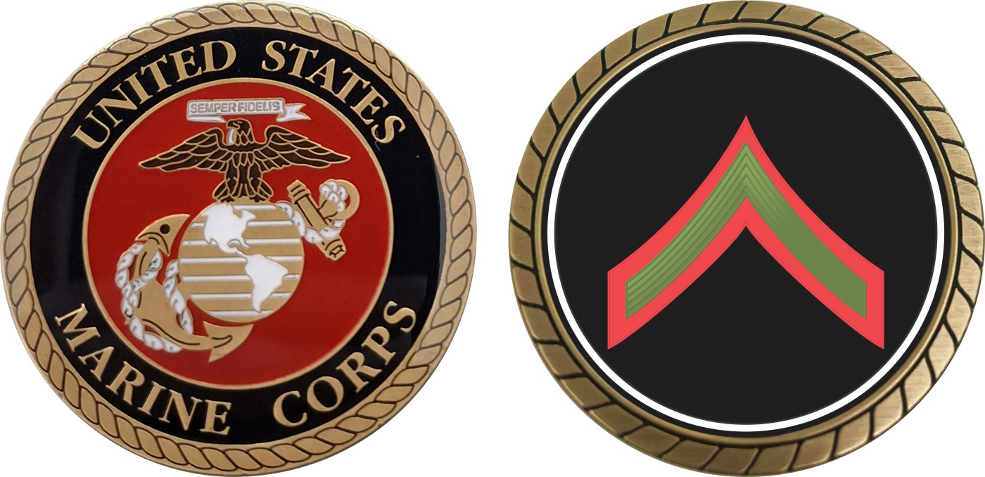 This 1 3/4” U.S.M.C. Private First Class Green / Red Chevron Challenge Coin is proudly offered by Militarybest. This Officially Licensed Marine Corps coin has beautiful enamel finish on one side and an organized crisp clean design on the opposite side.