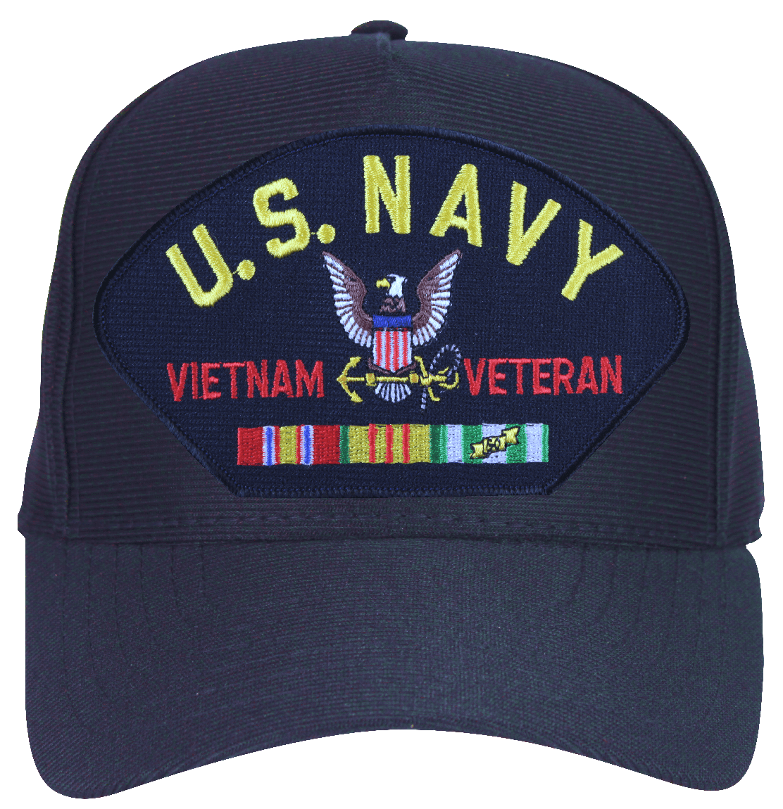 This U.S. Navy Vietnam Veteran Cap with Logo and Ribbons Ball Cap is an emblematic, poly, dark under the visor cap. Each has an adjustable strap, and is available as a 5 panel high profile or 6 panel low profile cap. All MilitaryBest caps are fully guaranteed. Some people call them Military Covers or Military Hats. This Military Cap is proudly Made in The U.S.A.For caps ordered with custom embroidered personalized text please allow an additional 3 to 5 days production time. All custom back text will be embroidered in ALL CAPITAL LETTERS. Caps with back text or eggs are non-returnable unless there is a material defect in the cap. If a style is not selected the cap will be made using a high profile style cap as pictured.