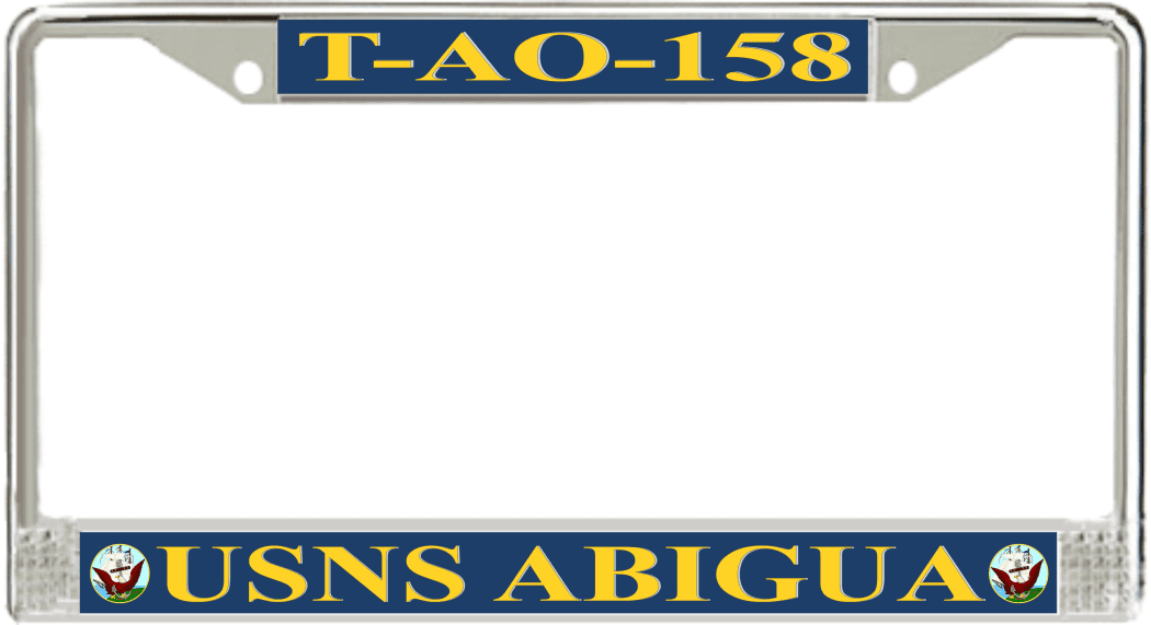 USNS Abigua T-AO-158 License Plate FrameThis USNS Abigua T-AO-158 License Plate Frame is proudly made in the USA at our facilities in Scottsboro, Alabama. Each of our MilitaryBest U.S. Navy Frames feature top and bottom Poly Coated Aluminum strips that are printed using sublimation which gives these quality automobile military frames a beautiful high gloss finish.