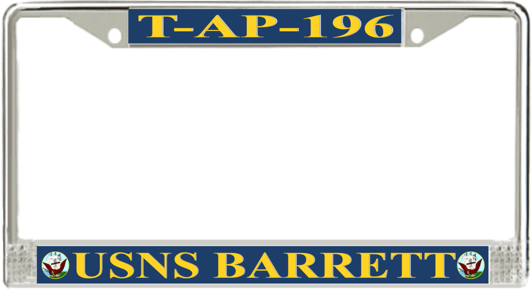 USNS Barrett T-AP-196 License Plate FrameThis USNS Barrett T-AP-196 License Plate Frame is proudly made in the USA at our facilities in Scottsboro, Alabama. Each of our MilitaryBest U.S. Navy Frames feature top and bottom Poly Coated Aluminum strips that are printed using sublimation which gives these quality automobile military frames a beautiful high gloss finish.