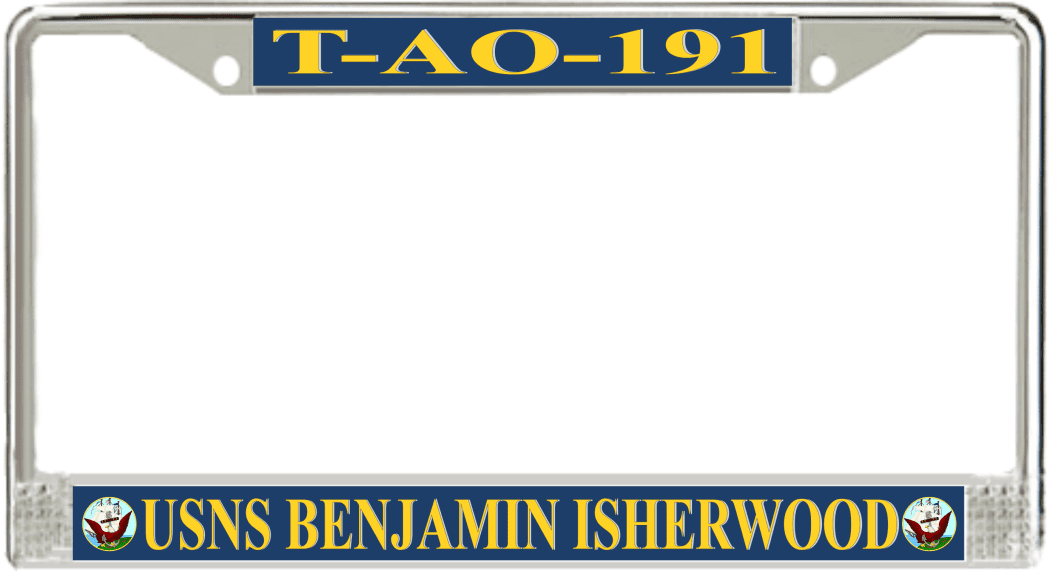 USNS Benjamin Isherwood T-AO-191 License Plate FrameThis USNS Benjamin Isherwood T-AO-191 License Plate Frame is proudly made in the USA at our facilities in Scottsboro, Alabama. Each of our MilitaryBest U.S. Navy Frames feature top and bottom Poly Coated Aluminum strips that are printed using sublimation which gives these quality automobile military frames a beautiful high gloss finish.