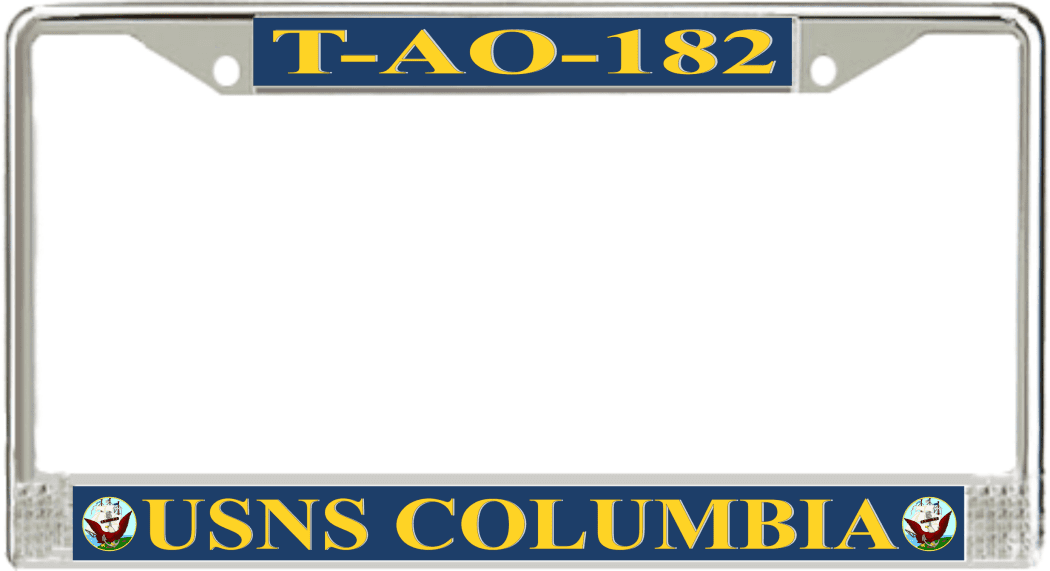 USNS Columbia T-AO-182 License Plate FrameThis USNS Columbia T-AO-182 License Plate Frame is proudly made in the USA at our facilities in Scottsboro, Alabama. Each of our MilitaryBest U.S. Navy Frames feature top and bottom Poly Coated Aluminum strips that are printed using sublimation which gives these quality automobile military frames a beautiful high gloss finish.