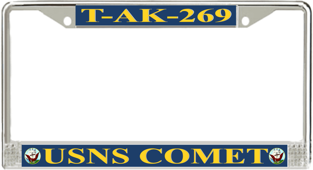 USNS Comet T-AK-269 License Plate FrameThis USNS Comet T-AK-269 License Plate Frame is proudly made in the USA at our facilities in Scottsboro, Alabama. Each of our MilitaryBest U.S. Navy Frames feature top and bottom Poly Coated Aluminum strips that are printed using sublimation which gives these quality automobile military frames a beautiful high gloss finish.