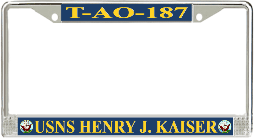 USNS Henry J. Kaiser T-AO-187 License Plate FrameThis USNS Henry J. Kaiser T-AO-187 License Plate Frame is proudly made in the USA at our facilities in Scottsboro, Alabama. Each of our MilitaryBest U.S. Navy Frames feature top and bottom Poly Coated Aluminum strips that are printed using sublimation which gives these quality automobile military frames a beautiful high gloss finish.
