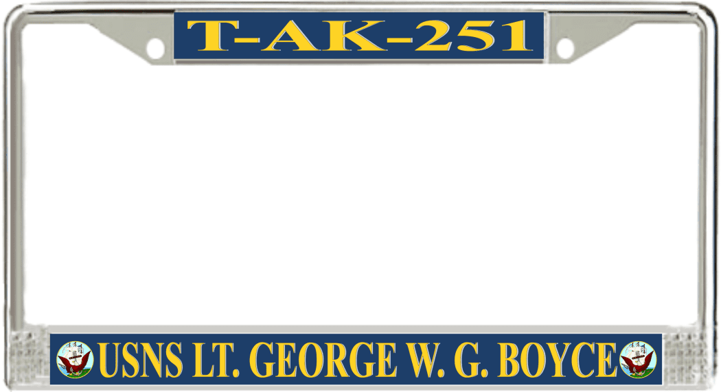 USNS Lt. George W. G. Boyce T-AK-251 License Plate FrameThis USNS Lt. George W. G. Boyce T-AK-251 License Plate Frame is proudly made in the USA at our facilities in Scottsboro, Alabama. Each of our MilitaryBest U.S. Navy Frames feature top and bottom Poly Coated Aluminum strips that are printed using sublimation which gives these quality automobile military frames a beautiful high gloss finish.