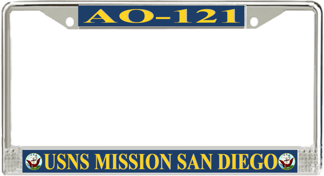 USNS Mission San Diego AO-121 License Plate FrameThis USNS Mission San Diego AO-121 License Plate Frame is proudly made in the USA at our facilities in Scottsboro, Alabama. Each of our MilitaryBest U.S. Navy Frames feature top and bottom Poly Coated Aluminum strips that are printed using sublimation which gives these quality automobile military frames a beautiful high gloss finish.