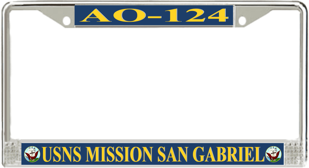 USNS Mission San Gabriel AO-124 License Plate FrameThis USNS Mission San Gabriel AO-124 License Plate Frame is proudly made in the USA at our facilities in Scottsboro, Alabama. Each of our MilitaryBest U.S. Navy Frames feature top and bottom Poly Coated Aluminum strips that are printed using sublimation which gives these quality automobile military frames a beautiful high gloss finish.