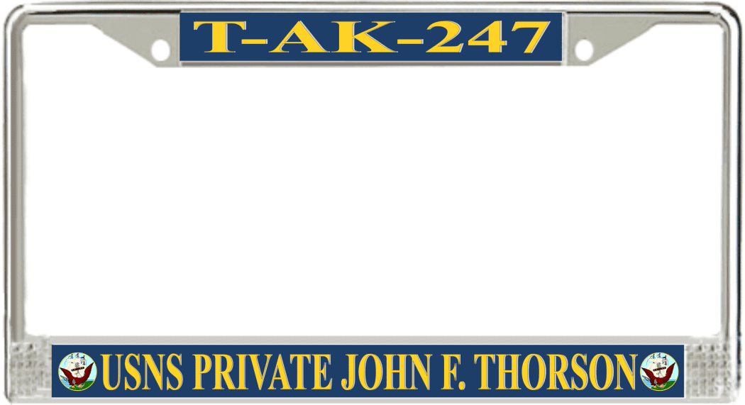 USNS Private John F. Thorson T-AK-247 License Plate FrameThis USNS Private John F. Thorson T-AK-247 License Plate Frame is proudly made in the USA at our facilities in Scottsboro, Alabama. Each of our MilitaryBest U.S. Navy Frames feature top and bottom Poly Coated Aluminum strips that are printed using sublimation which gives these quality automobile military frames a beautiful high gloss finish.