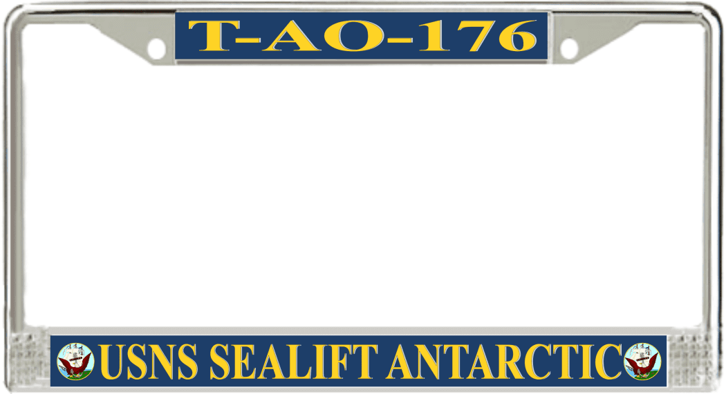 USNS Sealift Antarctic T-AO-176 License Plate FrameThis USNS Sealift Antarctic T-AO-176 License Plate Frame is proudly made in the USA at our facilities in Scottsboro, Alabama. Each of our MilitaryBest U.S. Navy Frames feature top and bottom Poly Coated Aluminum strips that are printed using sublimation which gives these quality automobile military frames a beautiful high gloss finish.
