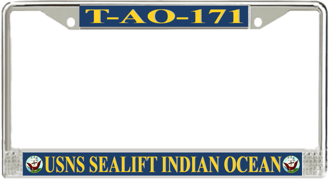 USNS Sealift Indian Ocean T-AO-171 License Plate FrameThis USNS Sealift Indian Ocean T-AO-171 License Plate Frame is proudly made in the USA at our facilities in Scottsboro, Alabama. Each of our MilitaryBest U.S. Navy Frames feature top and bottom Poly Coated Aluminum strips that are printed using sublimation which gives these quality automobile military frames a beautiful high gloss finish.