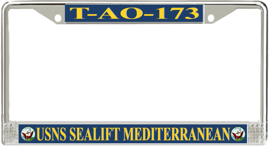 USNS Sealift Mediterranean T-AO-173 License Plate FrameThis USNS Sealift Mediterranean T-AO-173 License Plate Frame is proudly made in the USA at our facilities in Scottsboro, Alabama. Each of our MilitaryBest U.S. Navy Frames feature top and bottom Poly Coated Aluminum strips that are printed using sublimation which gives these quality automobile military frames a beautiful high gloss finish.