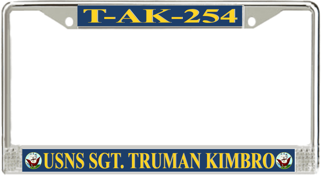 USNS Sgt. Truman Kimbro T-AK-254 License Plate FrameThis USNS Sgt. Truman Kimbro T-AK-254 License Plate Frame is proudly made in the USA at our facilities in Scottsboro, Alabama. Each of our MilitaryBest U.S. Navy Frames feature top and bottom Poly Coated Aluminum strips that are printed using sublimation which gives these quality automobile military frames a beautiful high gloss finish.