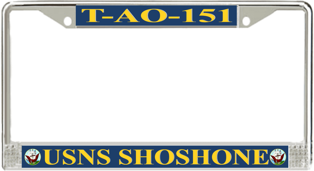 USNS Shoshone T-AO-151 License Plate FrameThis USNS Shoshone T-AO-151 License Plate Frame is proudly made in the USA at our facilities in Scottsboro, Alabama. Each of our MilitaryBest U.S. Navy Frames feature top and bottom Poly Coated Aluminum strips that are printed using sublimation which gives these quality automobile military frames a beautiful high gloss finish.
