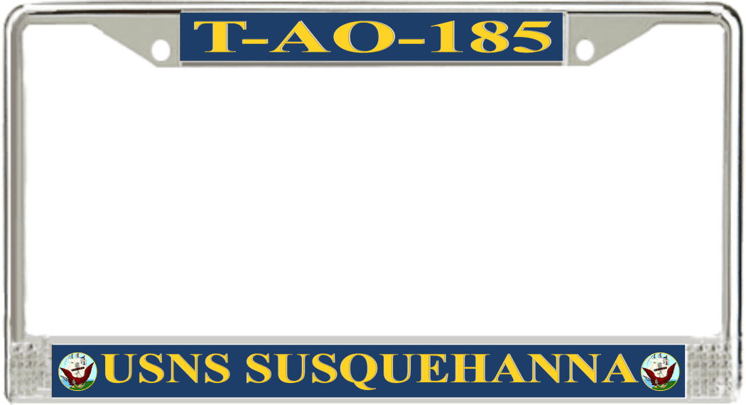 USNS Susquehanna T-AO-185 License Plate FrameThis USNS Susquehanna T-AO-185 License Plate Frame is proudly made in the USA at our facilities in Scottsboro, Alabama. Each of our MilitaryBest U.S. Navy Frames feature top and bottom Poly Coated Aluminum strips that are printed using sublimation which gives these quality automobile military frames a beautiful high gloss finish.