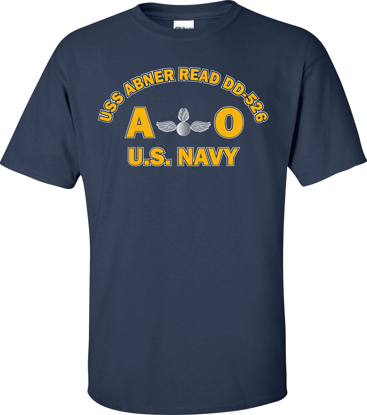 MilitaryBest is proud to offer this USS ABNER READ DD-526 Rate AO Aviation Ordnanceman T-Shirt. This shirt is available as a 100% cotton t-shirt or a 100% polyester men’s or women’s moisture wicking t-shirt. Each shirt is proudly printed in the USA.