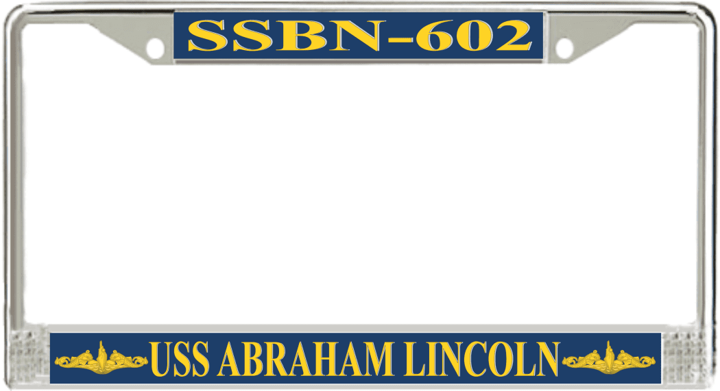 USS Abraham Lincoln SSBN-602 License Plate Frame This USS Abraham Lincoln SSBN-602 License Plate Frame is proudly made in the USA at our facilities in Scottsboro, Alabama. Each Frame features top and bottom sublimated design strips that are poly coated for a protective gloss finish. Please check your state and local regulations for compatibility of these frames for use on your vehicle.
