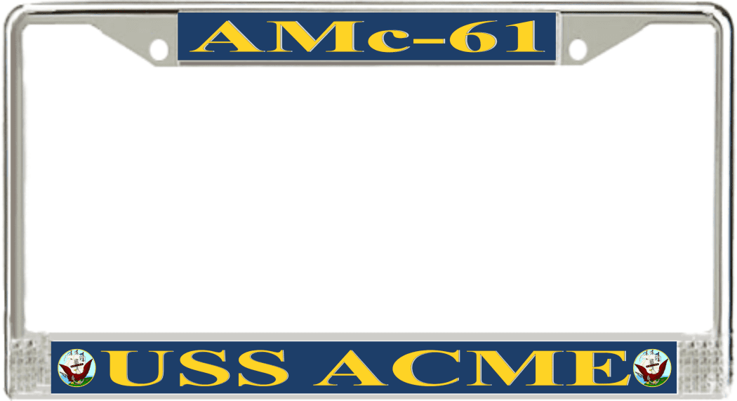USS Acme AMc-61 License Plate FrameThis USS Acme AMc-61 License Plate Frame is proudly made in the USA at our facilities in Scottsboro, Alabama. Each of our MilitaryBest U.S. Navy Frames feature top and bottom Poly Coated Aluminum strips that are printed using sublimation which gives these quality automobile military frames a beautiful high gloss finish.
