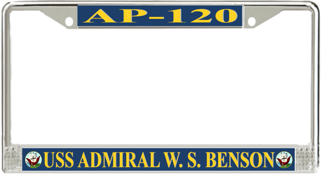 USS Admiral W. S. Benson AP-120 License Plate FrameThis USS Admiral W. S. Benson AP-120 License Plate Frame is proudly made in the USA at our facilities in Scottsboro, Alabama. Each of our MilitaryBest U.S. Navy Frames feature top and bottom Poly Coated Aluminum strips that are printed using sublimation which gives these quality automobile military frames a beautiful high gloss finish.