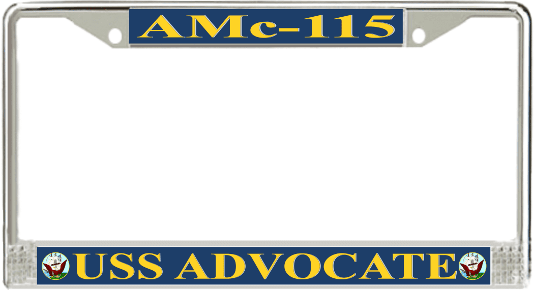 USS Advocate AMc-115 License Plate FrameThis USS Advocate AMc-115 License Plate Frame is proudly made in the USA at our facilities in Scottsboro, Alabama. Each of our MilitaryBest U.S. Navy Frames feature top and bottom Poly Coated Aluminum strips that are printed using sublimation which gives these quality automobile military frames a beautiful high gloss finish.