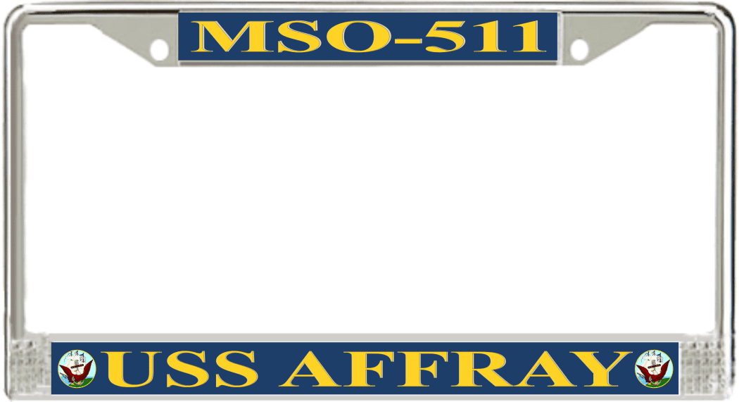USS Affray MSO-511 License Plate FrameThis USS Affray MSO-511 License Plate Frame is proudly made in the USA at our facilities in Scottsboro, Alabama. Each of our MilitaryBest U.S. Navy Frames feature top and bottom Poly Coated Aluminum strips that are printed using sublimation which gives these quality automobile military frames a beautiful high gloss finish.