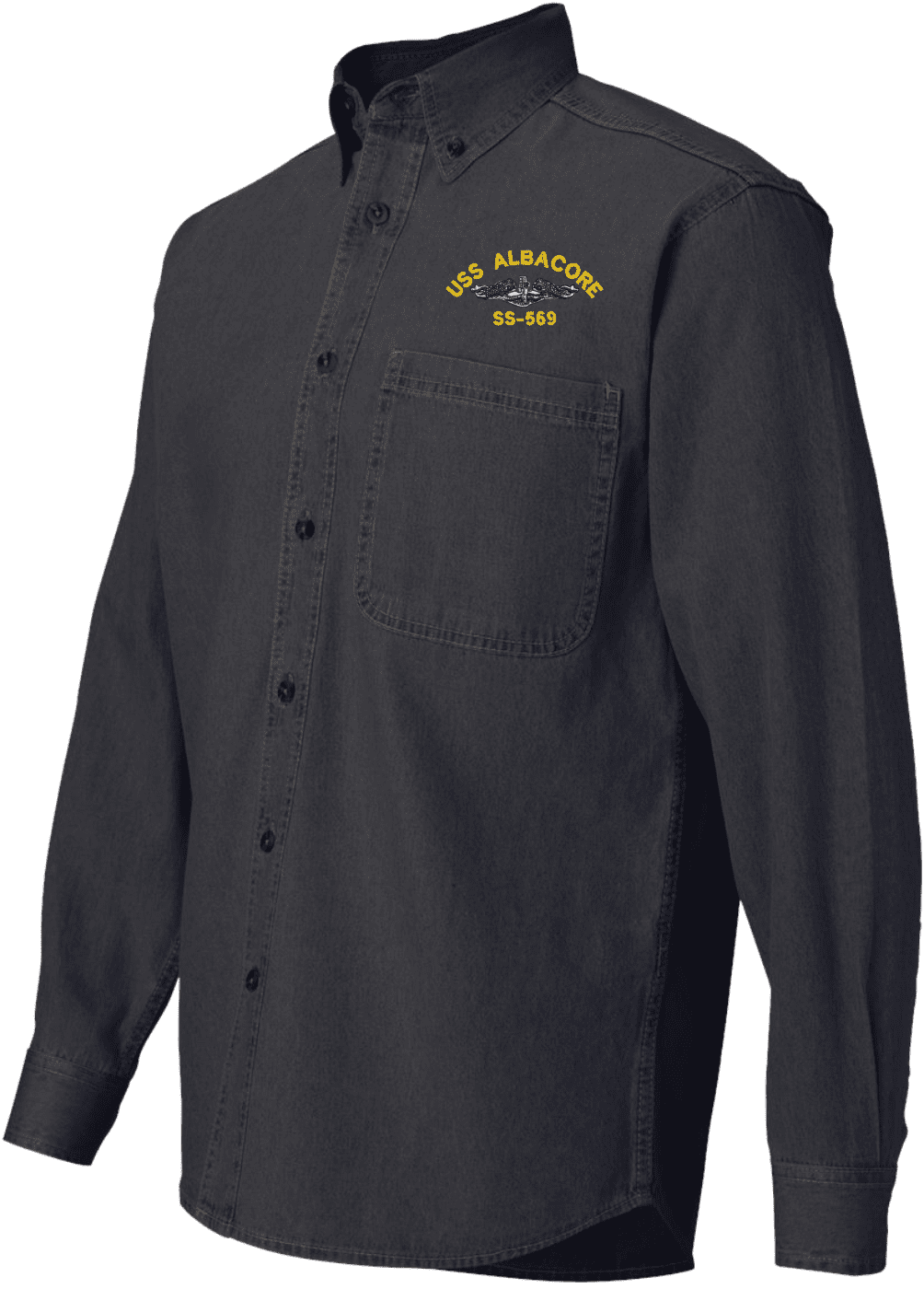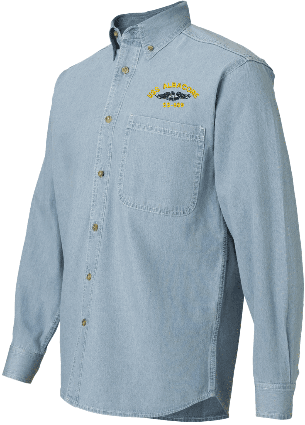 Militarybest is proud to offer this custom embroidered USS Albacore SS-569 with Dolphins Embroidered Denim Shirt. Each Shirt is embroidered with high quality Rapos thread utilizing our in house "Happy Brand" Embroidering Machines.
