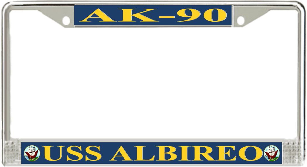 USS Albireo AK-90 License Plate FrameThis USS Albireo AK-90 License Plate Frame is proudly made in the USA at our facilities in Scottsboro, Alabama. Each of our MilitaryBest U.S. Navy Frames feature top and bottom Poly Coated Aluminum strips that are printed using sublimation which gives these quality automobile military frames a beautiful high gloss finish.