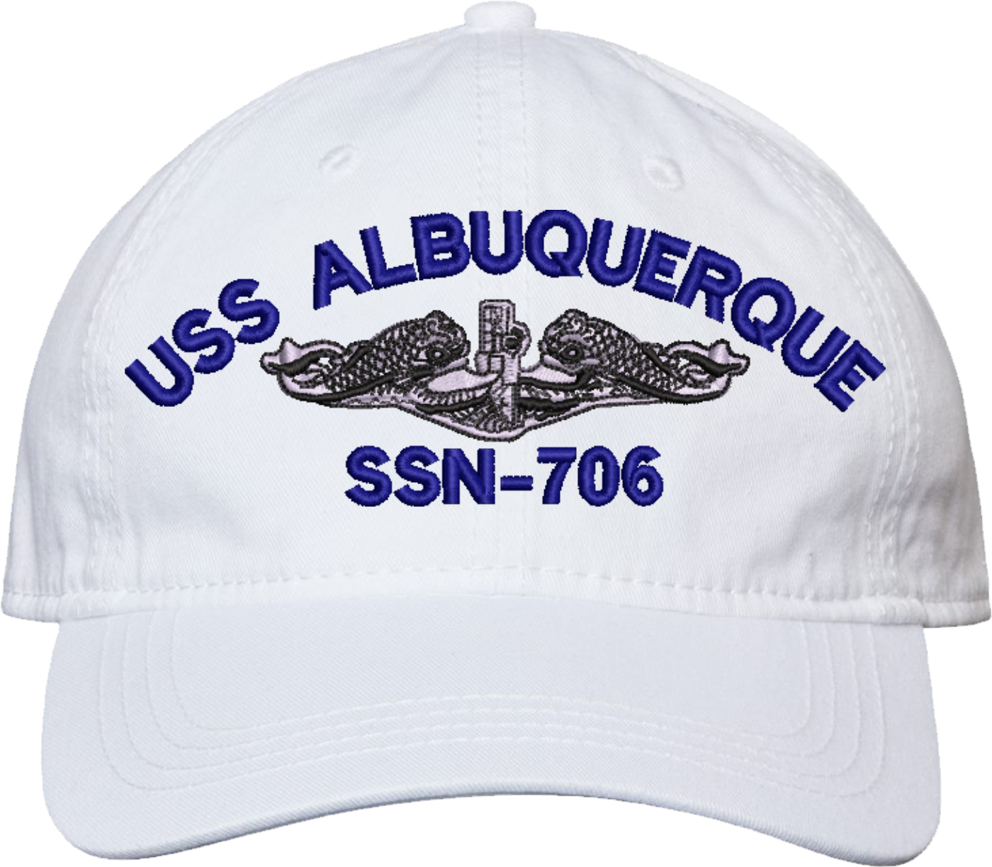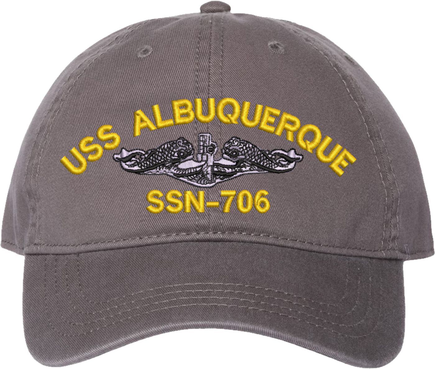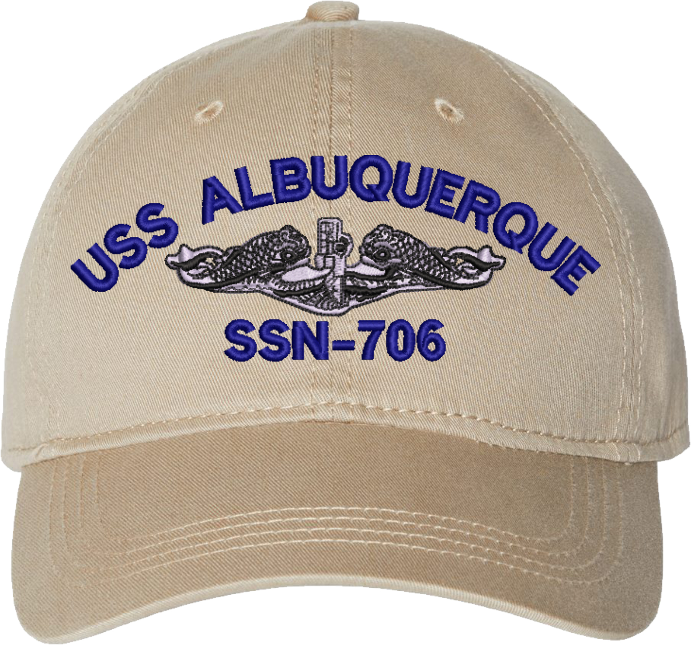 Show your Navy pride with this USS Albuquerque SSN-706 with Dolphins Unstructured Dad Cap from MilitaryBest. Crafted from 100% washed chino twill cotton, this six-panel, low-profile cap offers a relaxed and comfortable fit. Featuring high-quality embroidery done in our Scottsboro, Alabama facility, this cap is designed with a pre-curved visor and an adjustable tri-glide buckle closure for a perfect fit. Whether for everyday wear or as a meaningful gift, this cap is a great way to honor your own or a loved one's service.For caps ordered with custom embroidered personalized text please allow an additional 3 to 5 days production time. All custom back text will be embroidered in ALL CAPITAL LETTERS. Caps with back text or eggs are non-returnable unless there is a material defect in the cap.