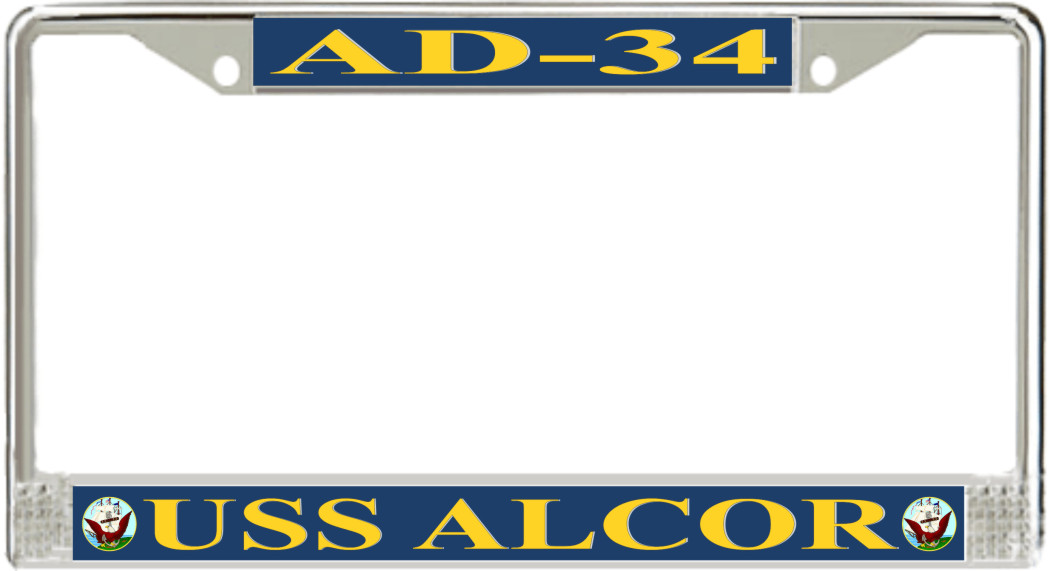 USS Alcor AD-34 License Plate FrameThis USS Alcor AD-34 License Plate Frame is proudly made in the USA at our facilities in Scottsboro, Alabama. Each of our MilitaryBest U.S. Navy Frames feature top and bottom Poly Coated Aluminum strips that are printed using sublimation which gives these quality automobile military frames a beautiful high gloss finish.