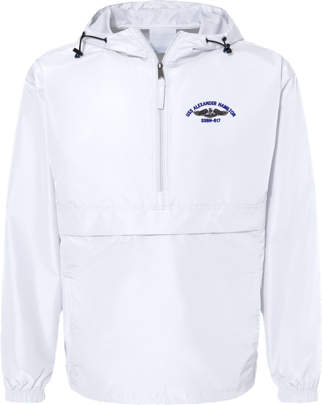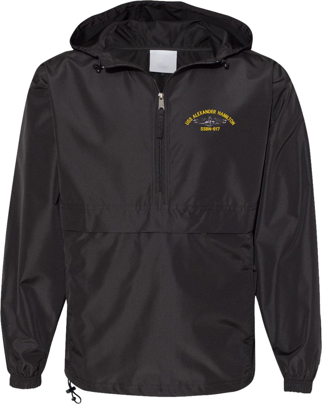 MilitaryBest is proud to offer this quality USS Alexander Hamilton SSBN-617 with Dolphins Hooded Windbreaker. Also known as an Anorak Jacket, this windbreaker is designed to keep wind and water out. With a design embroidered over the left chest, this windbreaker is embroidered to order at our facilities in Scottsboro, AL.. This windbreaker can be packed into the mesh lined pouch pocket for a more portable method of storage.- 100% Polyester