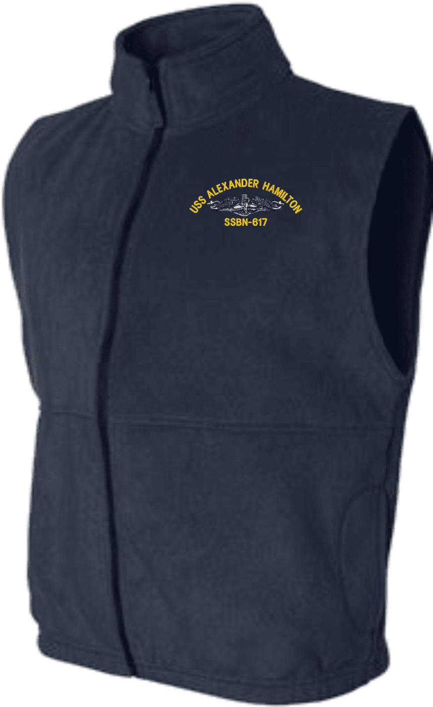 Note: Due to supply chain disruptions, some colors and sizes may not be available in the same brand, in these cases a brand of comarable quality will be used. Feel free to call in advance of your order, with questions you may have.MilitaryBest is proud to offer this qualityUSS Alexander Hamilton SSBN-617 with Dolphins Embroidered Fleece Vest. This Fleece Vest features a convertible collar with dyed-to-match zipper pull, oversized nylon reinforced slash pockets, and an elastic hem. It is made using a 100% anti-pill polyester Fleece Vest. This Fleece Vest will make an excellent addition to your wardrobe, or a quality gift. Your satisfaction is guaranteed! These quality fleece vests are proudly embroidered at our facilities in Scottsboro, AL. Support the Army MWR program by purchasing only from Licensed Vendors.