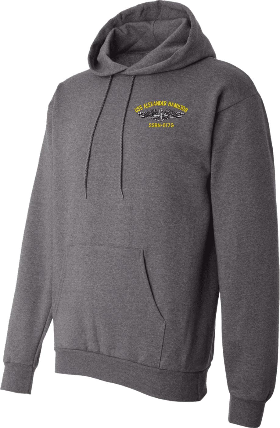 MilitaryBest has expanded its line of apparel with this custom embroidered USS Alexander Hamilton SSBN-617G with Dolphins Embroidered Hoodie. Each Hoodie is direct embroidered onto a Champion brand 9.5 oz 50/50 Cotton Poly blend. This Hoodie will make an excellent addition to your wardrobe, or a great gift. Your satisfaction is Guaranteed! These quality hoodies are proudly embroidered at our facilities in Scottsboro, AL. Support the Army MWR program by purchasing only from Licensed Vendors.