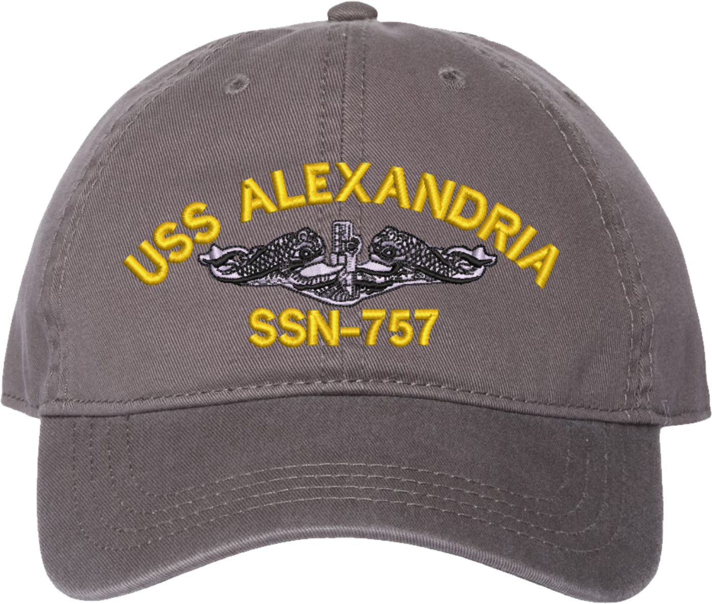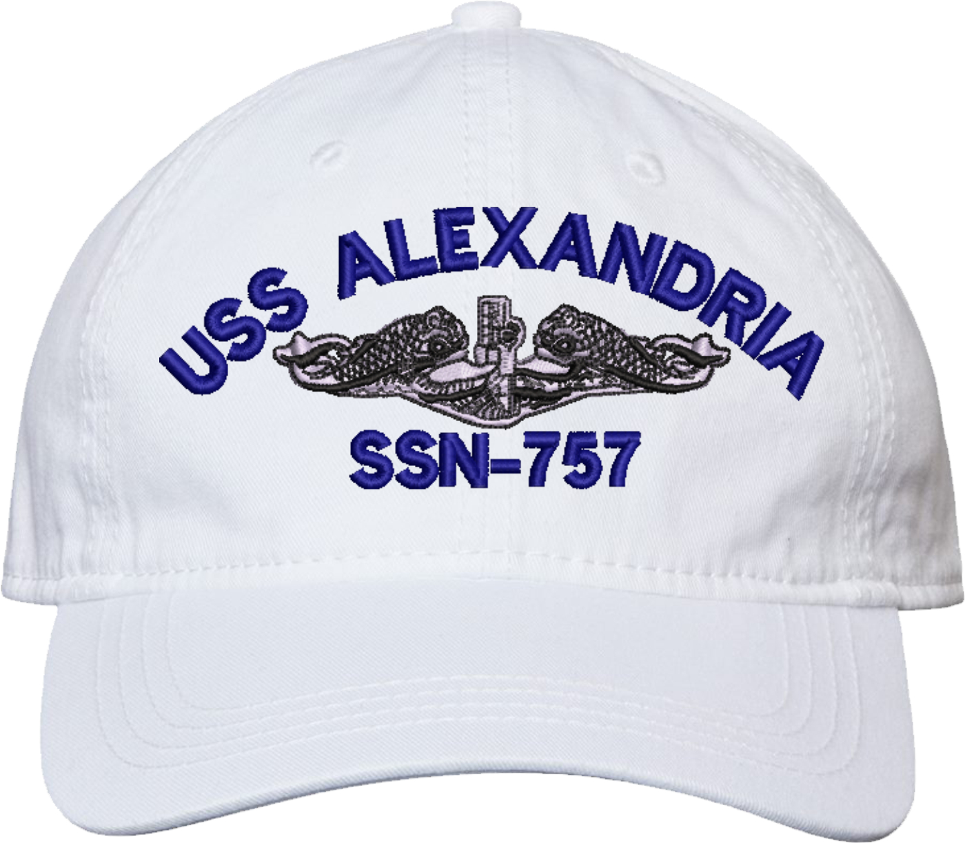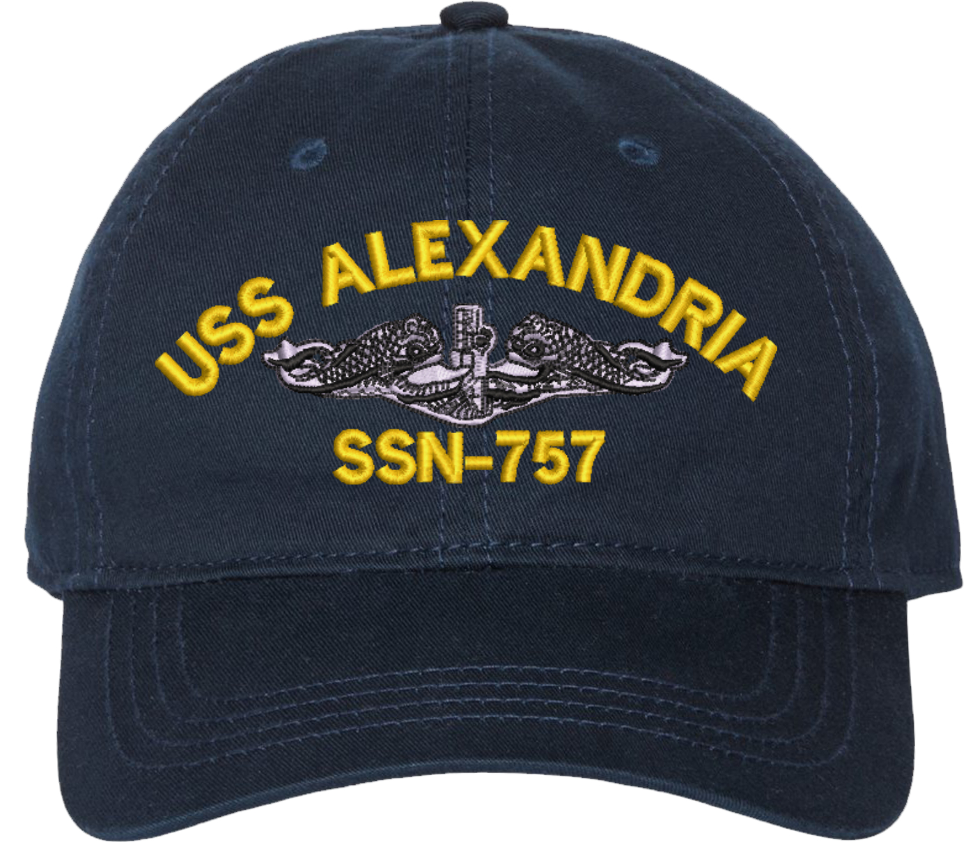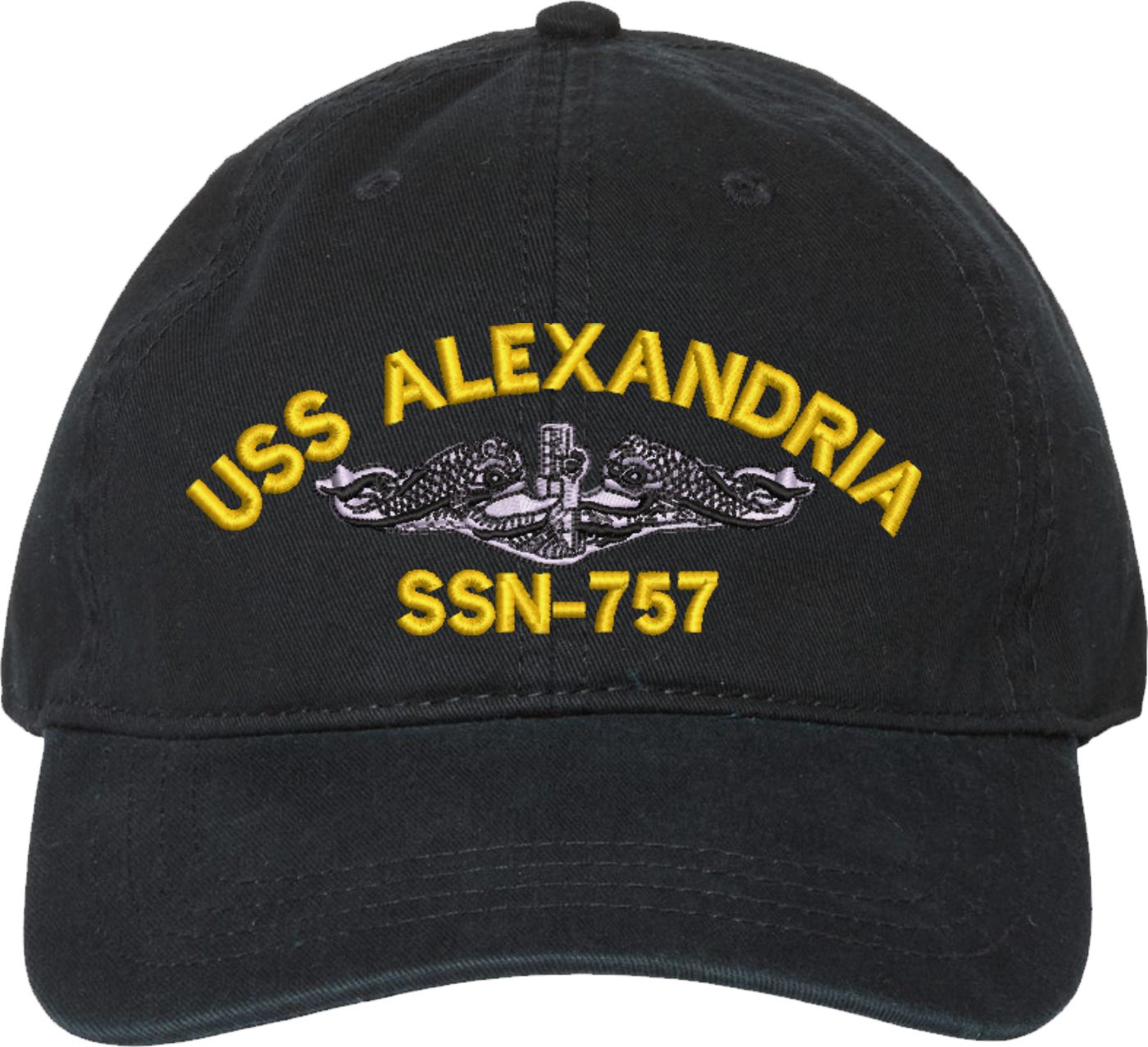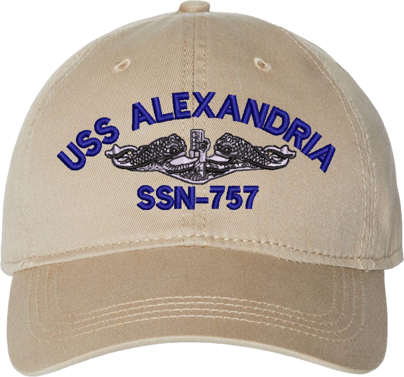 Show your Navy pride with this USS Alexandria SSN-757 with Dolphins Unstructured Dad Cap from MilitaryBest. Crafted from 100% washed chino twill cotton, this six-panel, low-profile cap offers a relaxed and comfortable fit. Featuring high-quality embroidery done in our Scottsboro, Alabama facility, this cap is designed with a pre-curved visor and an adjustable tri-glide buckle closure for a perfect fit. Whether for everyday wear or as a meaningful gift, this cap is a great way to honor your own or a loved one's service.For caps ordered with custom embroidered personalized text please allow an additional 3 to 5 days production time. All custom back text will be embroidered in ALL CAPITAL LETTERS. Caps with back text or eggs are non-returnable unless there is a material defect in the cap.