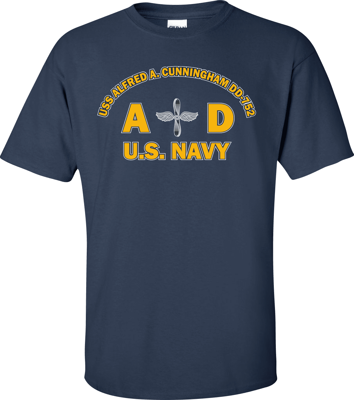 MilitaryBest is proud to offer this USS ALFRED A. CUNNINGHAM DD-752 Rate AD Aviation Machinist Mate T-Shirt. This shirt is available as a 100% cotton t-shirt or a 100% polyester men’s or women’s moisture wicking t-shirt. Each shirt is proudly printed in the USA.