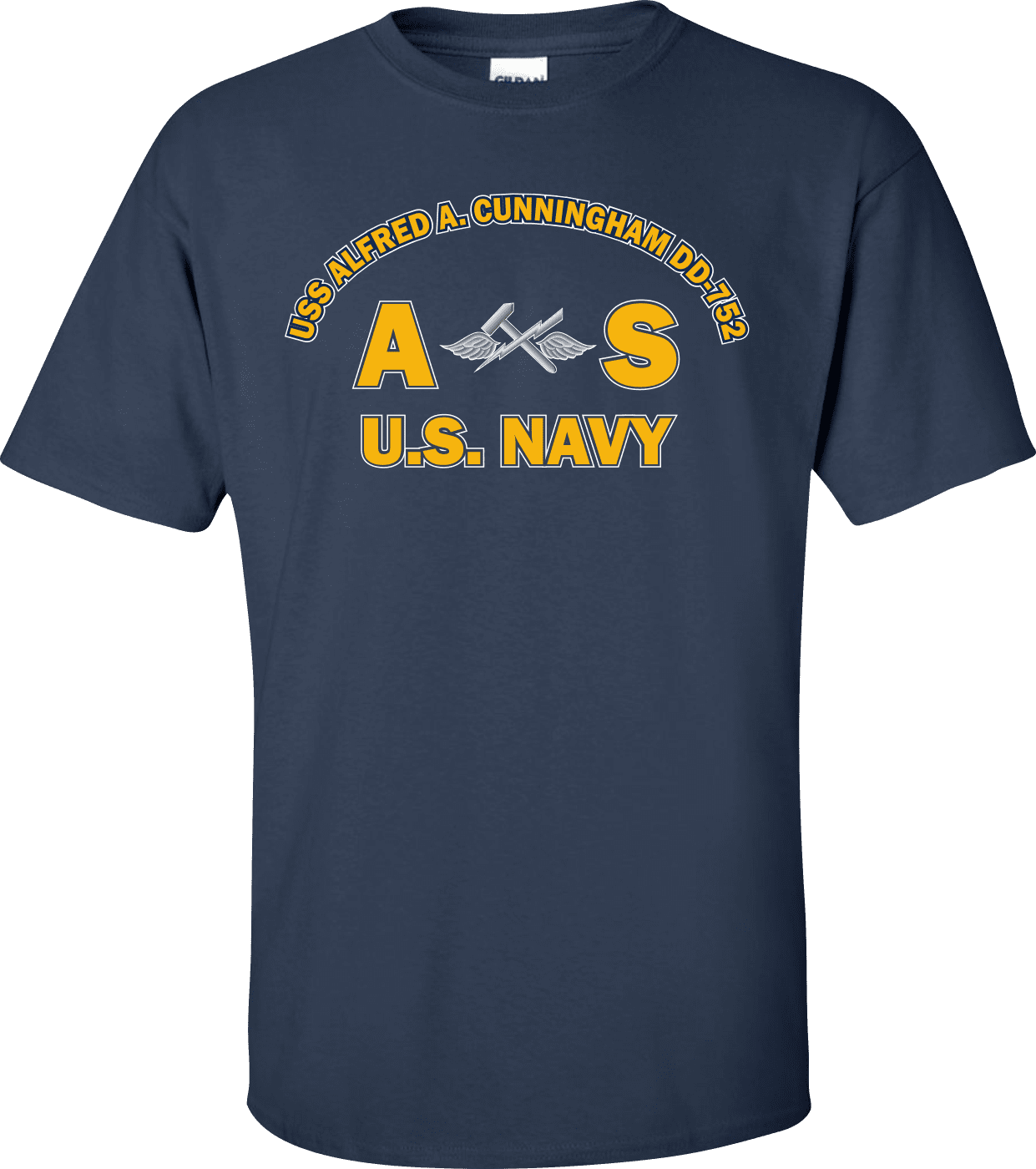 MilitaryBest is proud to offer this USS ALFRED A. CUNNINGHAM DD-752 Rate AS Aviation Support Equipment Technician T-Shirt. This shirt is available as a 100% cotton t-shirt or a 100% polyester men’s or women’s moisture wicking t-shirt. Each shirt is proudly printed in the USA.