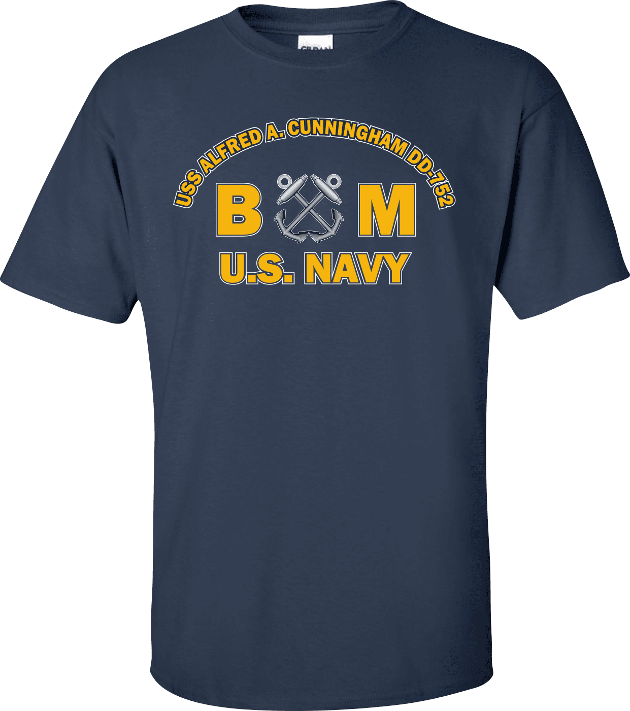 MilitaryBest is proud to offer this USS ALFRED A. CUNNINGHAM DD-752 Rate BM Boatswains Mate T-Shirt. This shirt is available as a 100% cotton t-shirt or a 100% polyester men’s or women’s moisture wicking t-shirt. Each shirt is proudly printed in the USA.