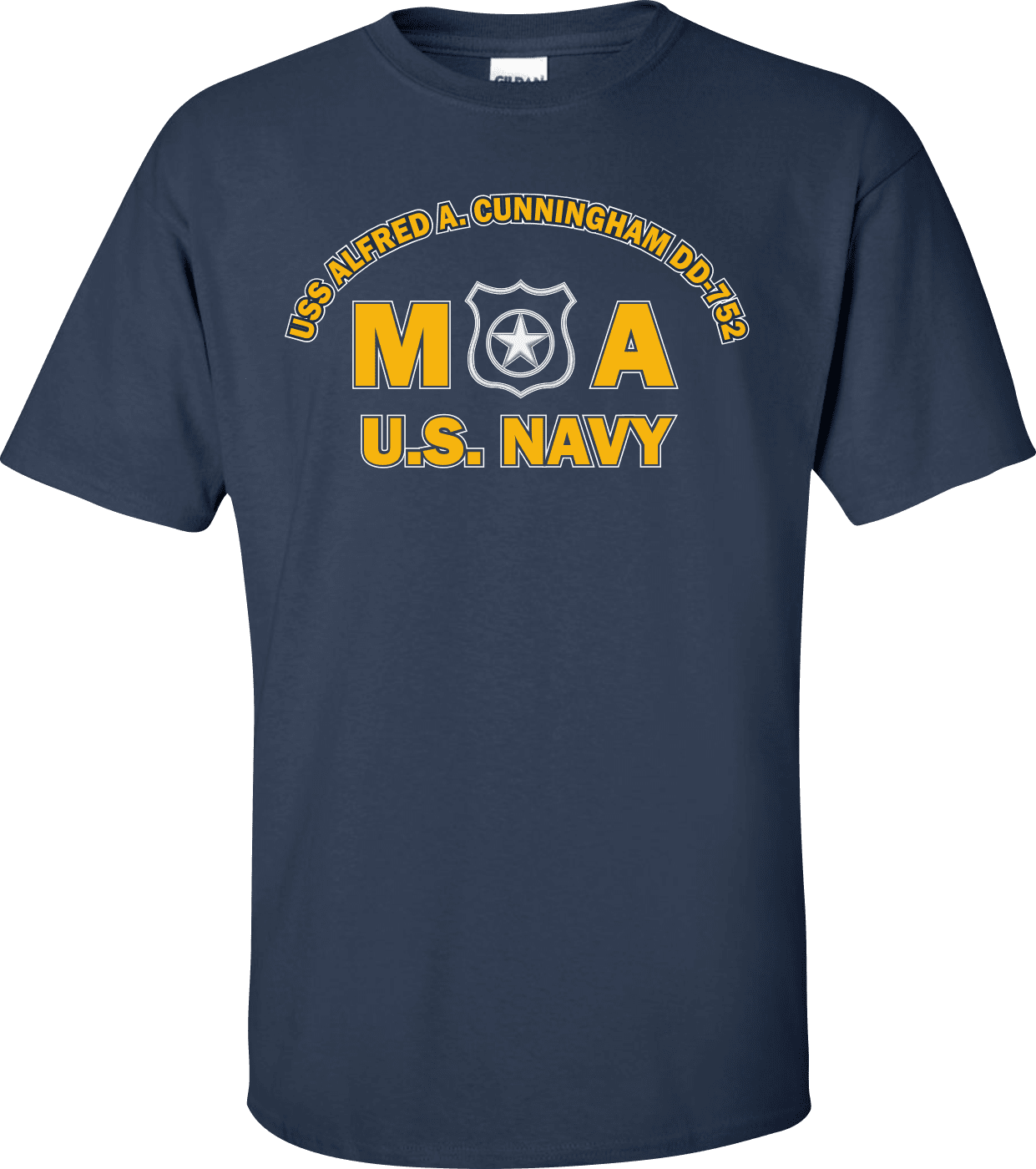 MilitaryBest is proud to offer this USS ALFRED A. CUNNINGHAM DD-752 Rate MA Master At Arms T-Shirt. This shirt is available as a 100% cotton t-shirt or a 100% polyester men’s or women’s moisture wicking t-shirt. Each shirt is proudly printed in the USA.