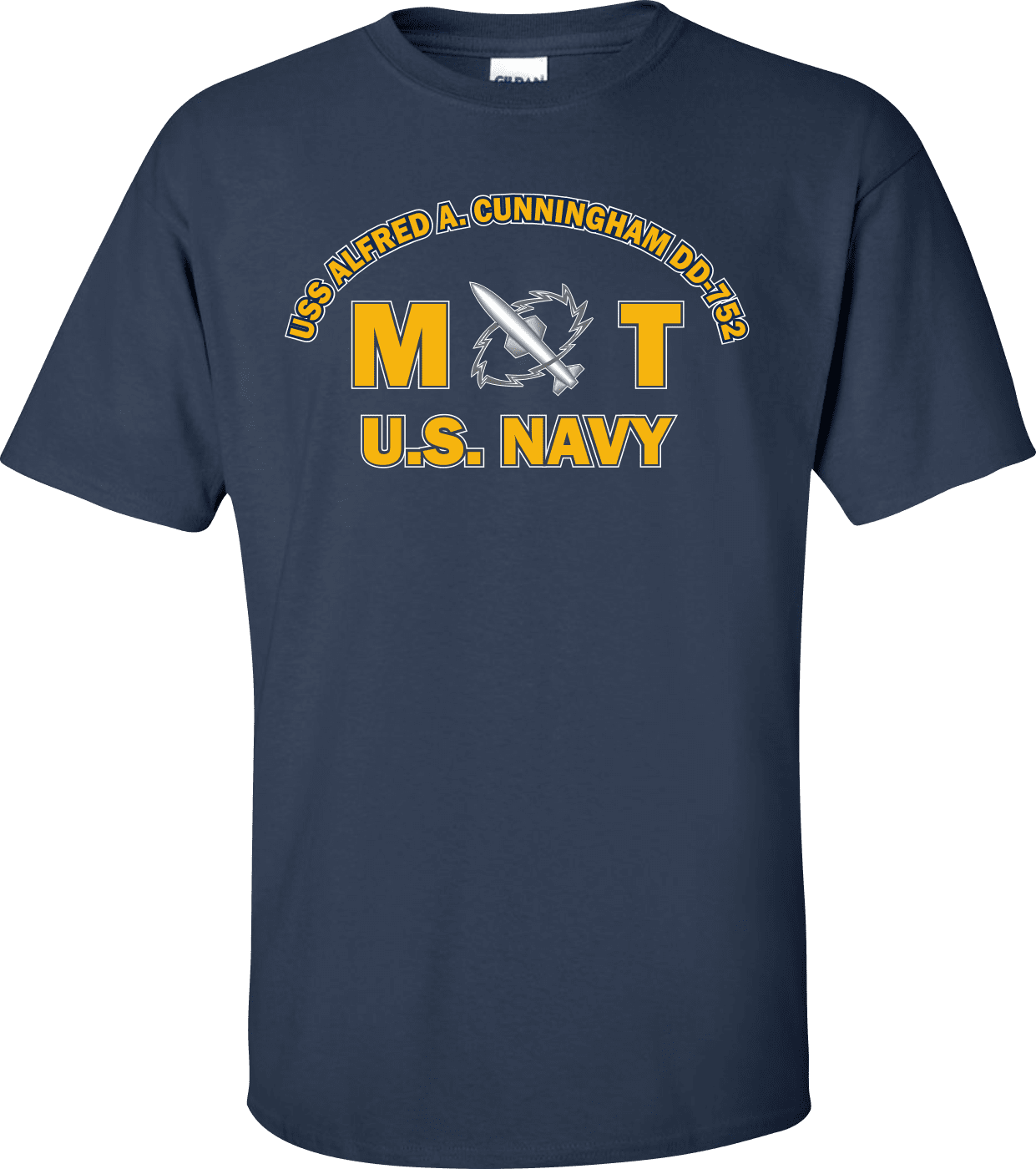 MilitaryBest is proud to offer this USS ALFRED A. CUNNINGHAM DD-752 Rate MT Missile Technician T-Shirt. This shirt is available as a 100% cotton t-shirt or a 100% polyester men’s or women’s moisture wicking t-shirt. Each shirt is proudly printed in the USA.