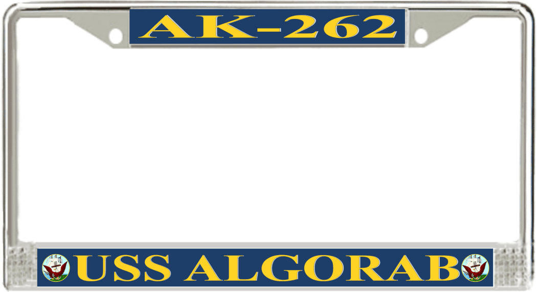 USS Algorab AK-262 License Plate FrameThis USS Algorab AK-262 License Plate Frame is proudly made in the USA at our facilities in Scottsboro, Alabama. Each of our MilitaryBest U.S. Navy Frames feature top and bottom Poly Coated Aluminum strips that are printed using sublimation which gives these quality automobile military frames a beautiful high gloss finish.