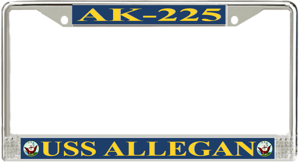 USS Allegan AK-225 License Plate FrameThis USS Allegan AK-225 License Plate Frame is proudly made in the USA at our facilities in Scottsboro, Alabama. Each of our MilitaryBest U.S. Navy Frames feature top and bottom Poly Coated Aluminum strips that are printed using sublimation which gives these quality automobile military frames a beautiful high gloss finish.