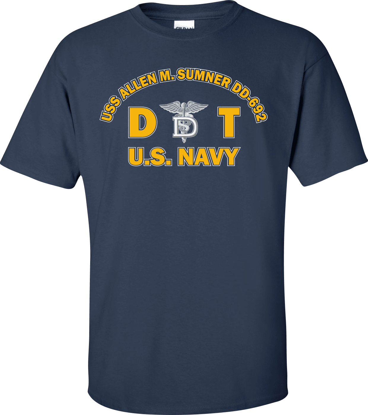MilitaryBest is proud to offer this USS ALLEN M. SUMNER DD-692 Rate DT Dental Technician T-Shirt. This shirt is available as a 100% cotton t-shirt or a 100% polyester men’s or women’s moisture wicking t-shirt. Each shirt is proudly printed in the USA.