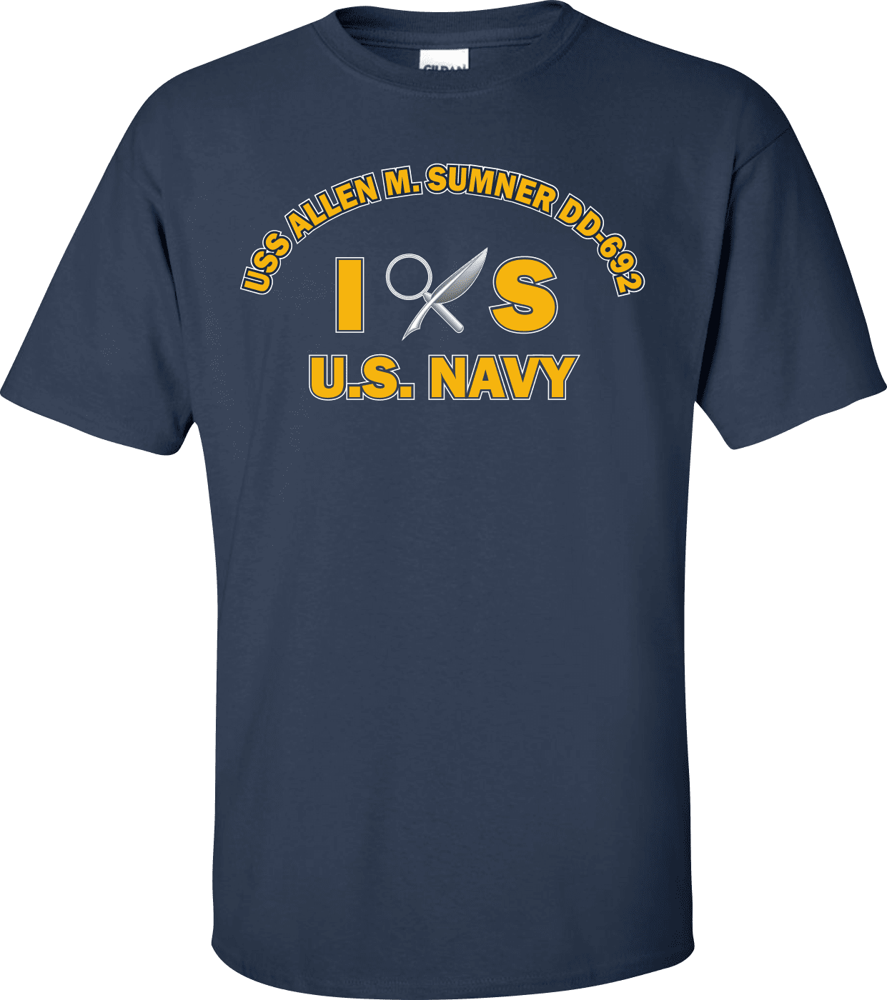 MilitaryBest is proud to offer this USS ALLEN M. SUMNER DD-692 Rate IS Intelligence Specialist T-Shirt. This shirt is available as a 100% cotton t-shirt or a 100% polyester men’s or women’s moisture wicking t-shirt. Each shirt is proudly printed in the USA.