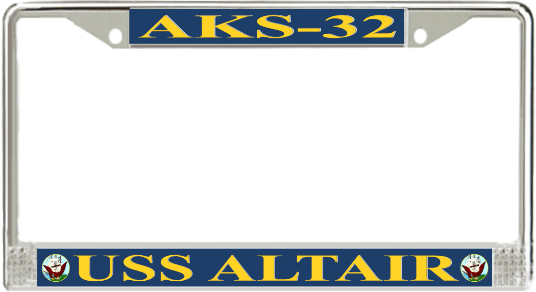 USS Altair AKS-32 License Plate FrameThis USS Altair AKS-32 License Plate Frame is proudly made in the USA at our facilities in Scottsboro, Alabama. Each of our MilitaryBest U.S. Navy Frames feature top and bottom Poly Coated Aluminum strips that are printed using sublimation which gives these quality automobile military frames a beautiful high gloss finish.