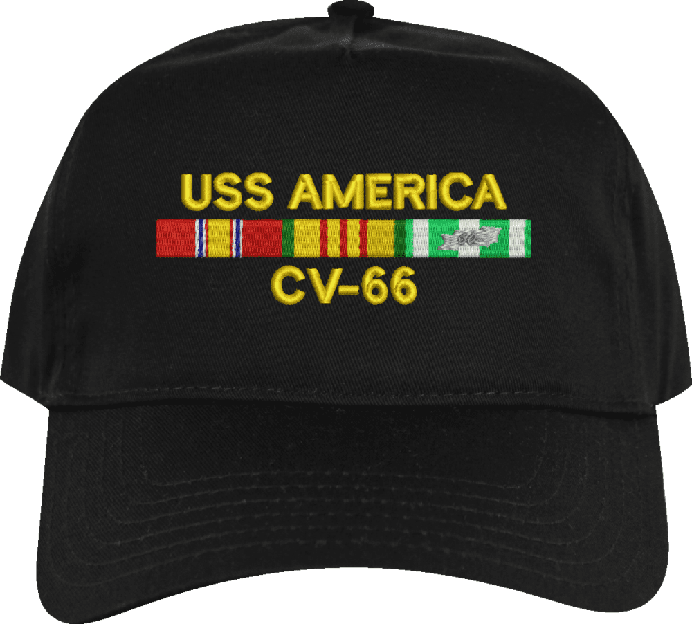 MilitaryBest is proud to offer this USS America CV-66 with Vietnam Service Ribbons Embroidered Cap. This cap is available in a 5 panel high profile or 6 panel low profile styling. All our caps are made from top quality materials. This cap would make a wonderful addition to your collection or a great gift! All custom embroidery is done at our facility in Scottsboro, AL. *Caps ordered with embroidered back text requires an additional 1 to 2 days of production time. All personalized caps will be embroidered in ALL CAPITAL LETTERS. Caps personalized with back text are not returnable unless there is a material defect in the cap.A percentage of the sale of each MilitaryBest item is forwarded to the licensing departments of each respective branch of service in support of the MWR (Morale, Welfare, & Recreation) program. These payments are made by either ALL4U LLC or the wholesaler from where the item originated. Our team thanks you for your service and your support of these programs.